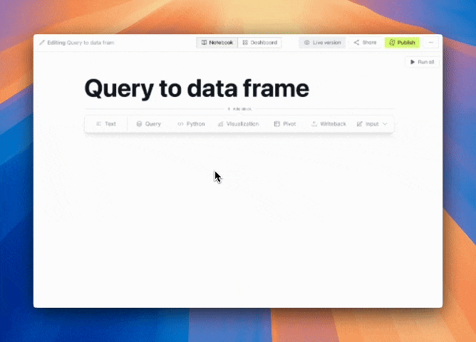 Click the plus icon that appears next to “Pages” on the left sidebar to create a new page. You can then add blocks to your page by clicking the “add block” button that appears when you hover over the gaps between blocks. We recommend that you start with a query block to fetch some data from your data source. Then, you can use that query’s result in your Python blocks by using the variable name that appears on the top of the query block, as shown in the example below.