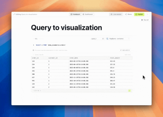 Use Python, SQL, or point-and-click visualizations to create your first page. After creating your first page using the notebook view, you can switch to the dashboard view and drag and drop your blocks into it.