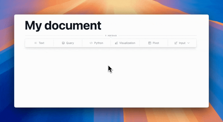 Briefer’s editor is where you’ll edit your pages, write code, and create visualizations. Every page is made of blocks. You can add a new block by clicking the plus icon that appears when you hover over the gaps between blocks.